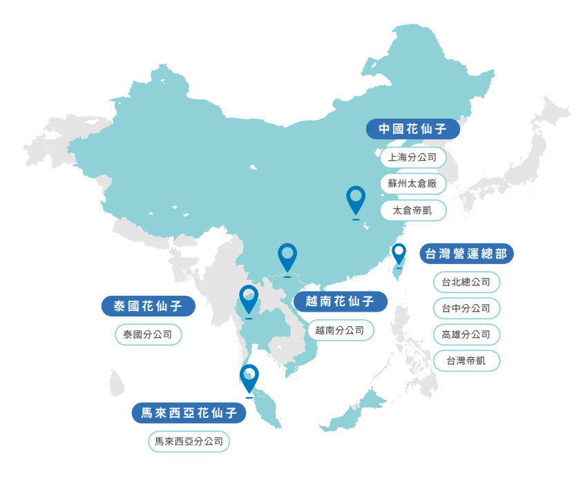 花仙子的國際化之路,始於2001年對泰國市場的拓展,之後陸續進軍中國大陸、馬來西亞、越南等地,海外市場營收占比,已達集團營收的三成以上。王佳郁強調,海外市場是花仙子未來發展的「重中之重」,近年來對大陸市場發展較為保守,但進入時間頗早的泰國市場,獲利已不輸台灣,至於起步中的越南、馬來西亞,則維持穩定成長。